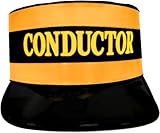 Black train conductor hat with yellow screen printed “Conductor” and gold trim accents. 100% cotton, exclusive of brim and trim.